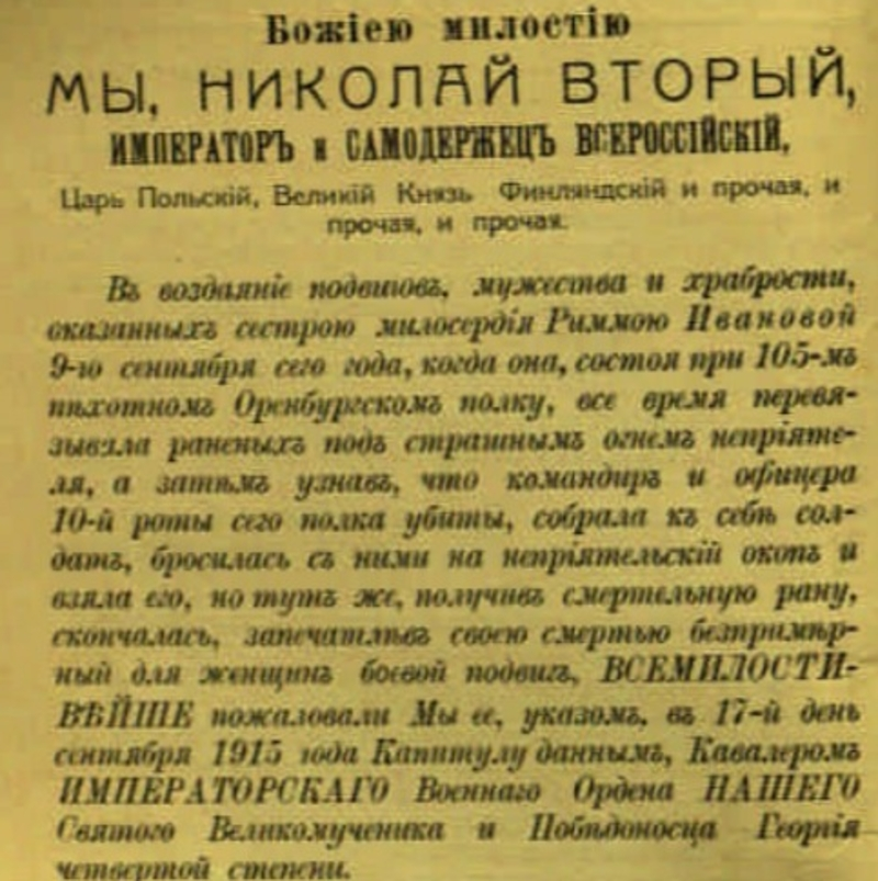 «Всемилостивейше пожаловали Мы её указом в 17 день сентября 1915 года…кавалером императорского военного ордена Нашего Святого Великомученика и Победоносца Георгия четвёртой степени»,