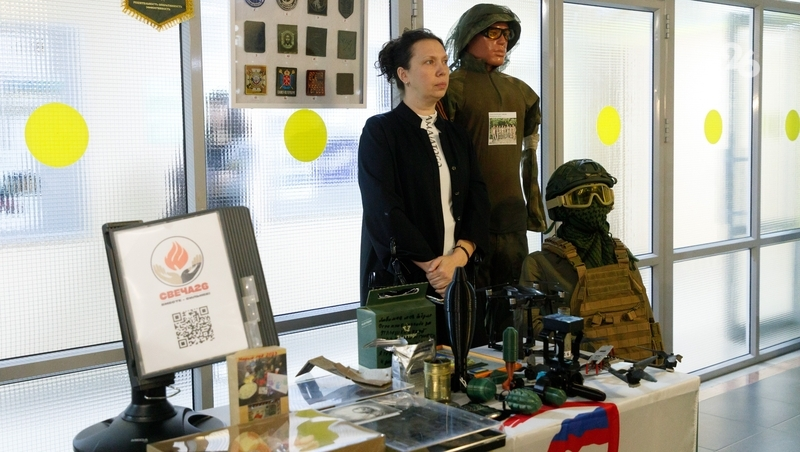На форуме работал стенд с трофеями, вещами и снаряжением бойцов СВО. Около него стояла мать военнослужащего Наталья Никонова. Женщина является администратором сообщества активистов «Свеча 26».