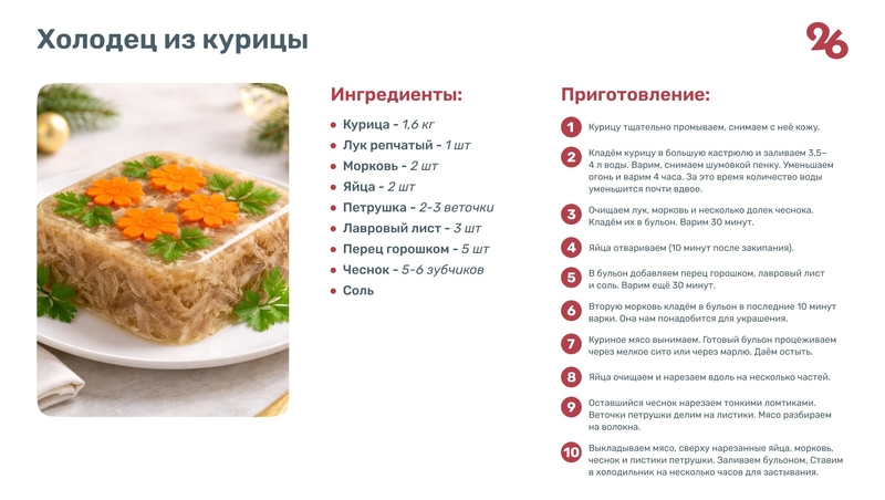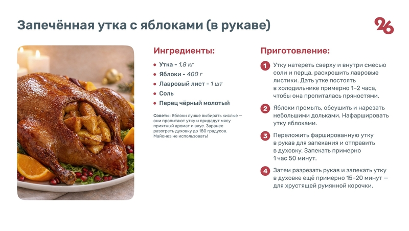 По словам диетолога, на столе обязательно должны быть белковые блюда. К ним относятся запечённые рыба, утка или курица. Во время приготовления рекомендуют использовать меньше сопутствующих ингредиентов, например, картошки и специй.