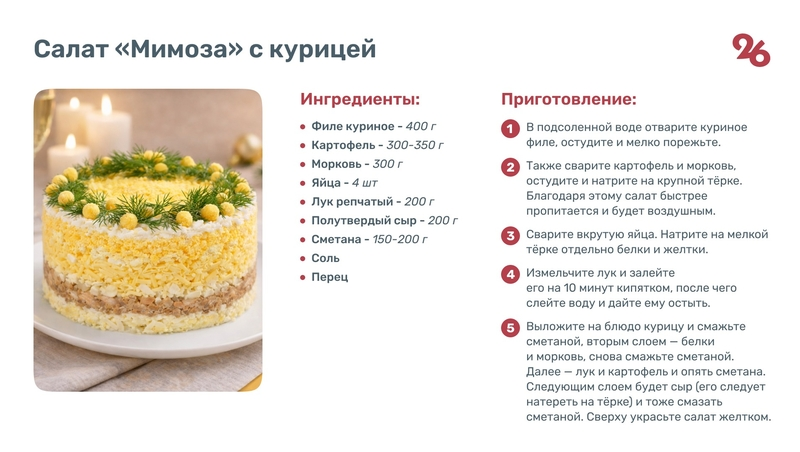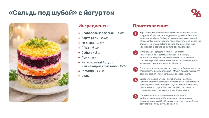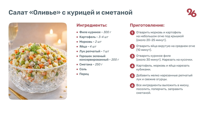 В традиционных салатах «Оливье», «Мимоза», «Сельдь под шубой» специалисты советуют заменить майонез на сметану, греческий йогурт или взять привычную заправку, но с маленькой жирностью. Также можно есть такие салаты без заправки.