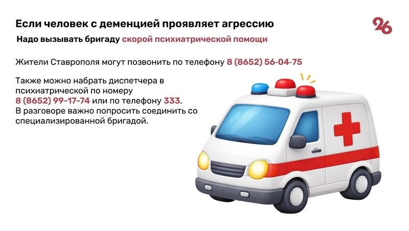 Если человек проявляет агрессию, в минздраве Ставрополья советуют вызывать бригаду скорой психиатрической помощи. Жители Ставрополя могут позвонить по телефону 8 (8652) 56‑04‑75, набрать диспетчера в психиатрической больнице по номеру 8 (8652) 99-17-74. Ещё можно обратиться в скорую помощь — 333 — и попросить соединить со специализированной бригадой.