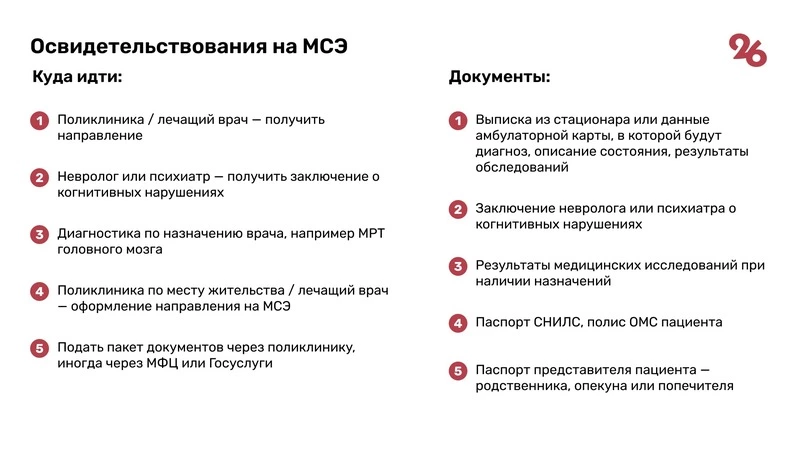Чтобы оформить инвалидность, надо пройти МСЭ. Для этой экспертизы понадобится выписка из стационара либо амбулаторной карты с диагнозом, описанием состояния и результатами обследований. Затем надо записаться к неврологу или психиатру и получить заключение о когнитивных нарушениях. Иногда назначаются дополнительные обследования, например, МРТ головного мозга.