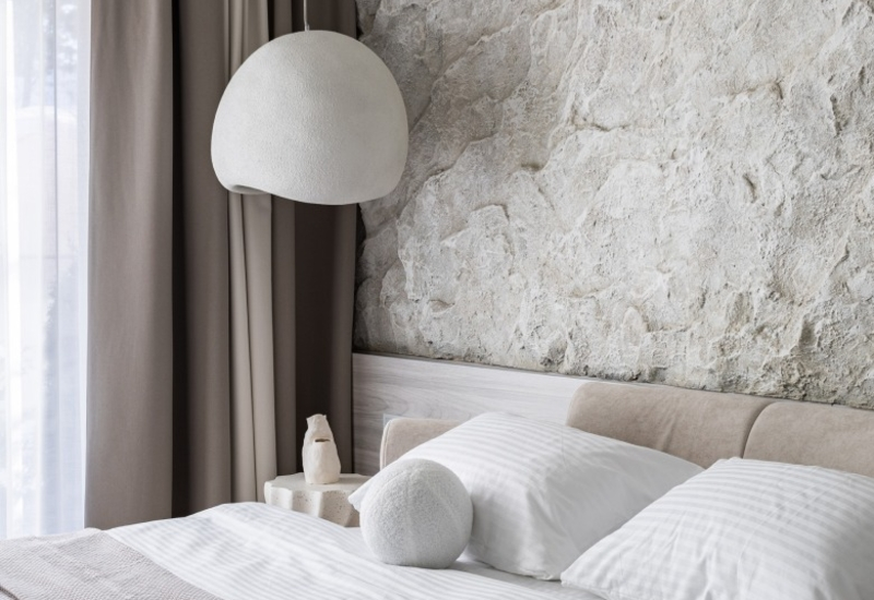 И здесь внимание гостей бутик-отеля привлекут необычные интерьерные решения: окно-иллюминатор в комнате, раздвигающее пространство, светлая гамма красок, в которые окрашены стены с рисунком в виде растений, и небесного цвета потолок, как портал в бесконечность.