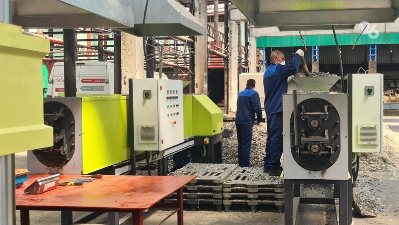 Цех оснащён отечественным оборудованием: дробильной установкой для измельчения вторсырья, модулем гранулирования, который разогревает материал и создаёт полимерный расплав, и прессом для изготовления продукции. Линию обслуживают четыре-пять специалистов.
