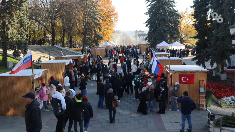 С 10:00 в центре Пятигорска перекрыто движение и звучит патриотическая музыка. Чтобы продемонстрировать единство народов, проживающих на Северном Кавказе, на курорте организовали ярмарку мастеров народных промыслов и ремёсел, а также мастер-классы.