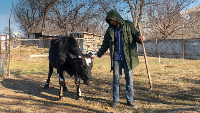 Илья Зыков два раза в день кормит и доит животных. По его словам, вместе с парнокопытными по территории гуляют собака, кошка и курицы.