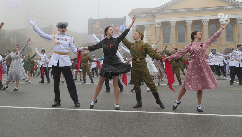 Студенты ставропольских вузов выступили перед зрителями парада с вальсом Победы.