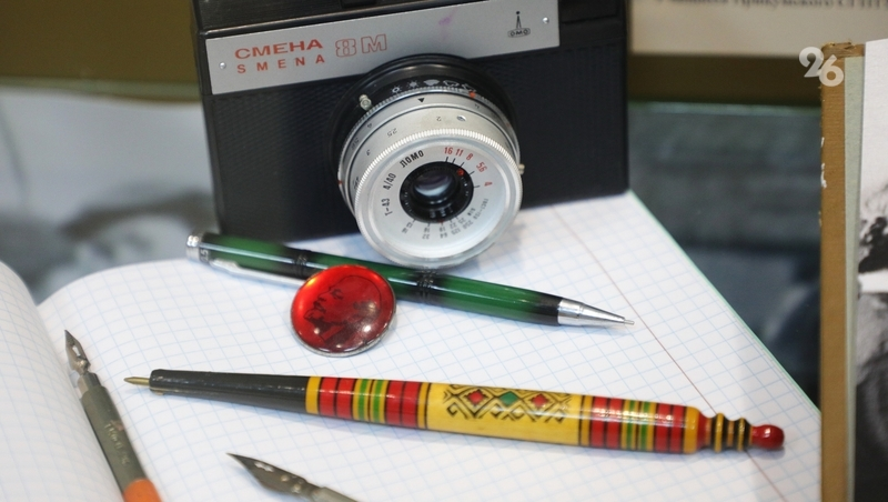 На выставке показали советские плакаты, пропагандирующие просвещение. Там же — старые фотографии, канцелярские принадлежности и другие материальные свидетельства прошедших эпох.