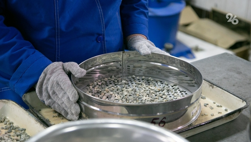 Техник-лаборант проверяет зерновой состав щебня на соответствие ГОСТу. После проверки качества это сырьё будет использоваться для производства асфальтобетонной смеси.
