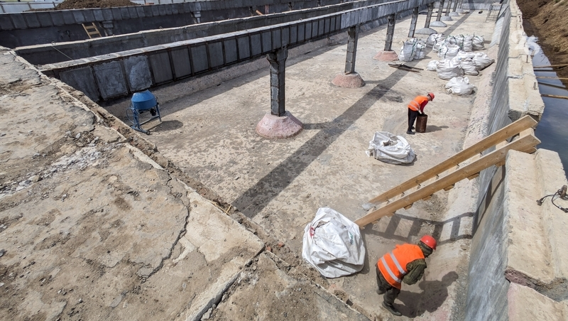 «Предстоит уложить столбики и пористые плиты, засыпать фильтрующий элемент — кварцевый песок, установить промывочные системы гидрорыхлителя и плиты перекрытия, заменить всё технологическое оборудование и озеленить территорию. Рабочие стараются находиться здесь каждый день, вне зависимости от погоды — для сдачи объекта в срок»,