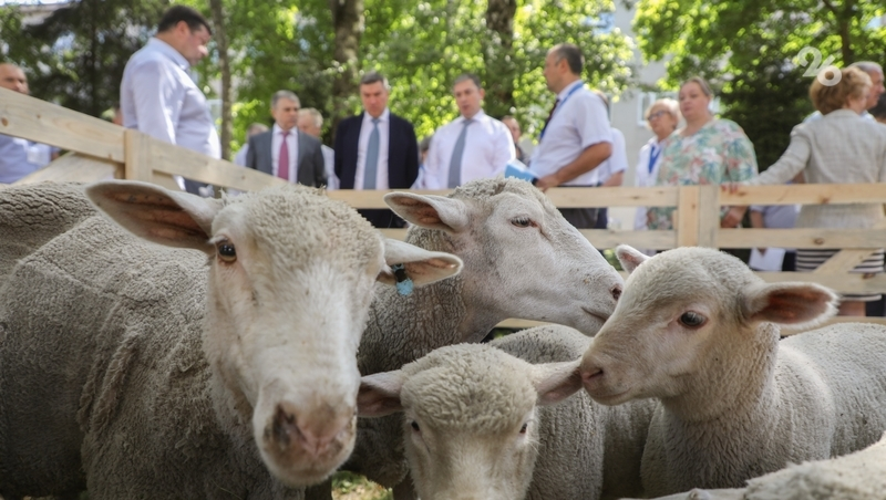 На лужайках расположились загоны с овцами тонкорунных пород. Причём федеральные посетители смогли сравнить местных и зарубежных животных — и более высокую оценку получили именно российские овечки.