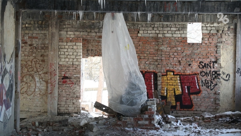 Для тренировки выбрали заброшенный двухэтажный дом на просторном полигоне. Место совсем не случайное, оно подходит для проигрываемого сценария спасения человека. На первом этаже студенты садятся в своеобразный кокон из обычного мешка. Далее собаки на втором этаже ищут в полу то самое место, под которым находится «жертва».