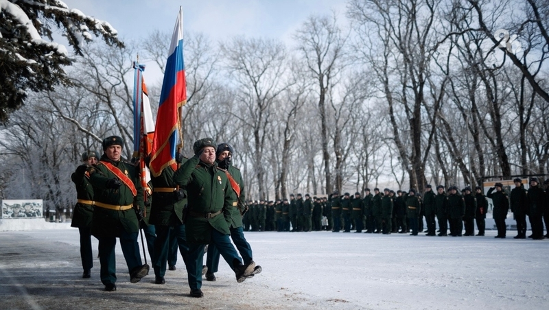 Мероприятие закончилось торжественным маршем личного состава военной части. Участники шагали по заснеженной площади под счёт.