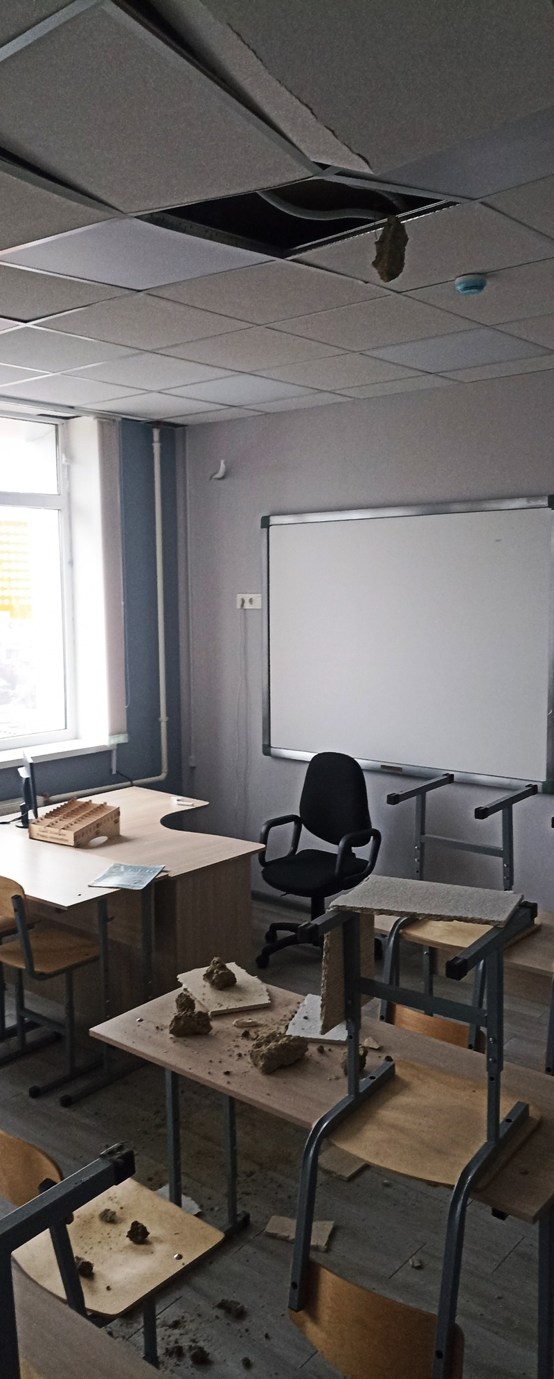 «С утра перед уроками учитель открыл окно на проветривание. От сильного порыва ветра был повреждён фрагмент потолочной конструкции. В кабинете никого не было, никто не пострадал. Все уроки проводились в штатном режиме в других кабинетах. Сейчас подрядная организация проводит восстановительные работы»,