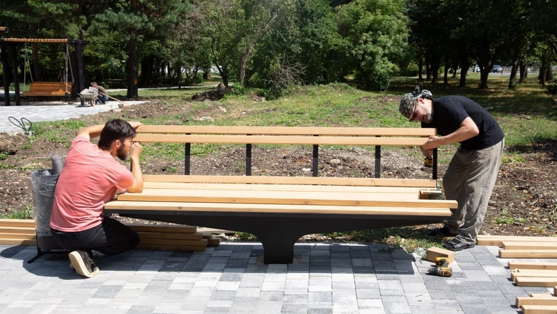 Как отмечается, уже уложены почти все дорожки, скоро на территории начнётся монтаж уличного освещения и камер наблюдения. Также рабочие устанавливают скамейки, качели, столы, навесы и ставят урны.