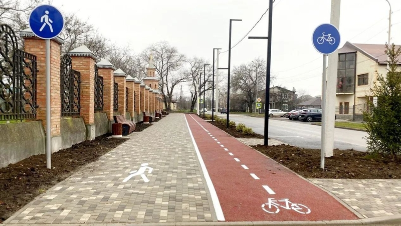 На участках обустроили тротуары и велодорожки, рабочие нанесли разметку, установили лавочки и наружное освещение. Они также озеленили территорию.