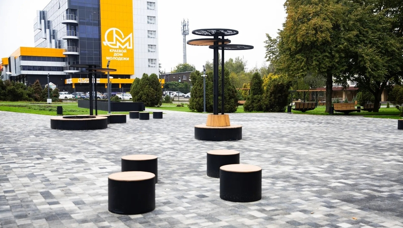 Пространство перед заводом «Нептун» наполнилось лавочками, качелями, шезлонгами, беседками и навесами. На территории места отдыха проложили пешеходные дорожки и уложили газон, объект оснастили фонарями, камерами видеонаблюдения. Также по краевой программе в сквере обустроили тренажёрную зону.