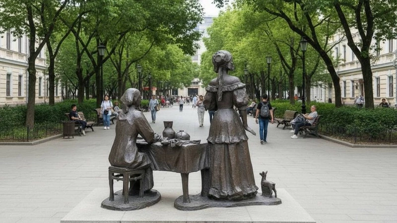 Улицу возле рынка украсят бронзовые скульптуры «Барышня с собачкой и крестьянка» и семь котов в разных позах, а также монета — гривенник Екатерины II. Будут установлены скамьи, вазоны, навесы, качели, качалки, горки, урны, столб навигации, клумбы и смотровой бинокль.