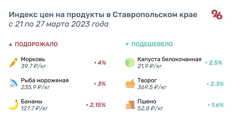 Из продуктов за неделю на Ставрополье подорожали морковь на 4% — до 39,7 рублей за кг, неразделанная мороженая рыба на 3% — до 235,9 рублей за кг и бананы на 2,15% — до 127,7 рублей за кг. А снизились на 2,5% белокочанная капуста — до 21,9 рубля за кг, на 2,3% творог — до 369,5 рублей за кг и на 1,6% пшено — до 52,8 рублей за кг.