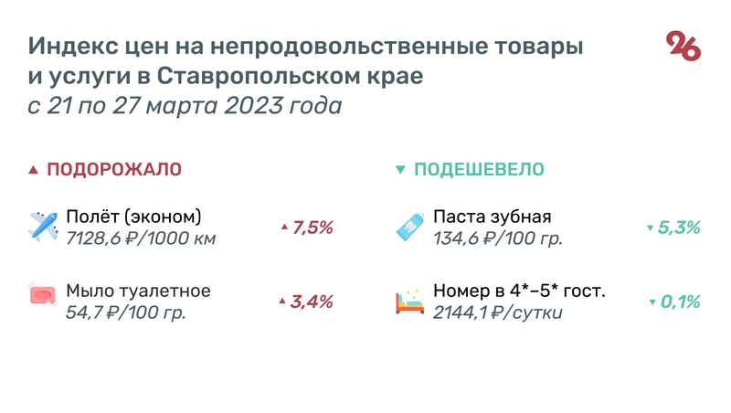 Среди товаров рост показали туалетное мыло на 3,4% — до 54,7 рублей за 100 грамм и полёты эконом-классом на 7,5% — до 7128,6 рублей за тысячу км. А снизились зубная паста на 5,3% — до 134,6 рублей за 100 грамм и номер в 4*и 5* гостинице на 0,1% — 2144,1 рублей за сутки.