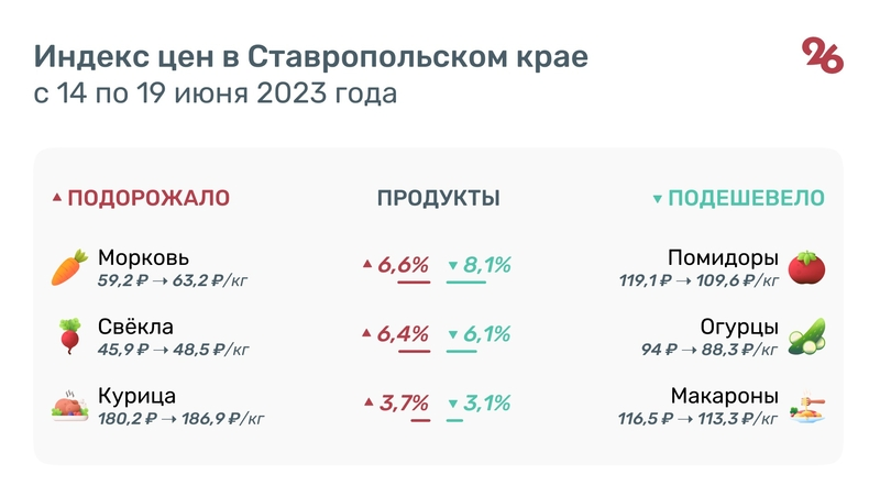 Еженедельный мониторинг цен на продукты, товары и услуги в Ставропольском крае, проведённый Северо-Кавказстатом, показал, что за прошедшую неделю в регионе подорожали морковь, свёкла и охлаждённая курица. Цена на овощи выросла на 6,6% и 6,4% соответственно. Сейчас килограмм моркови в среднем по региону стоит 63,2 рубля за килограмм, а свёклы — 48,5 рубля за килограмм. Курица выросла в цене на 3,7% — до 186,9 рубля за килограмм. Стоит отметить, что на эти же продукты цены росли и на прошлой неделе.