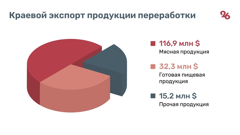 Ведущее место в общем объёме экспорта продукции переработки принадлежит мясным продуктам — их доля составляет 65%. В первом полугодии экспорт такой продукции увеличился на 9% и составил около 117 млн долларов. При этом мяса птицы за первые шесть месяцев текущего года продали за границу на 34% больше, чем за тот же период 2022 года, — 55,8 тыс. тонн. Основным покупателем стал Китай — общая сумма экспорта в эту страну превысила 49 млн долларов.