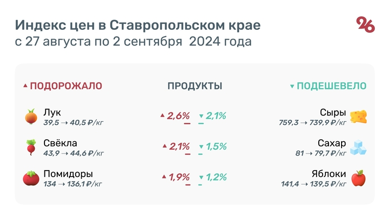 С 27 августа по 2 сентября на Ставрополье на 2,5% выросла цена лука — 40,5 руб. за кг. Свёкла подорожала на 2,1% — 44,6 руб. за кг, а помидоры — на 1,8%: 136,1 руб. за кг.