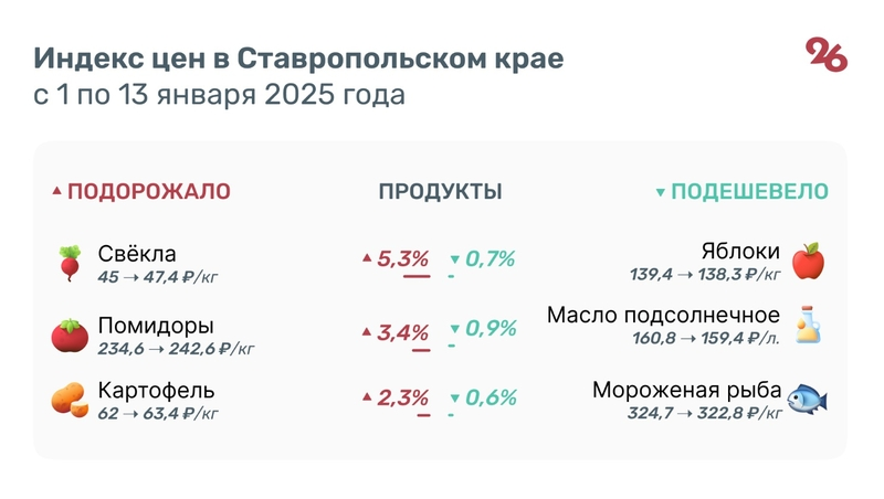 После новогодних праздников на Ставрополье выросла цена овощей. На 5,3% подорожала свёкла — 47,4 руб. за кг, на 3% — лук (53,5 руб. за кг), на 2,4% — морковь (41,5 руб. за кг) и на 2,3% — картофель (63,4 руб. за кг).