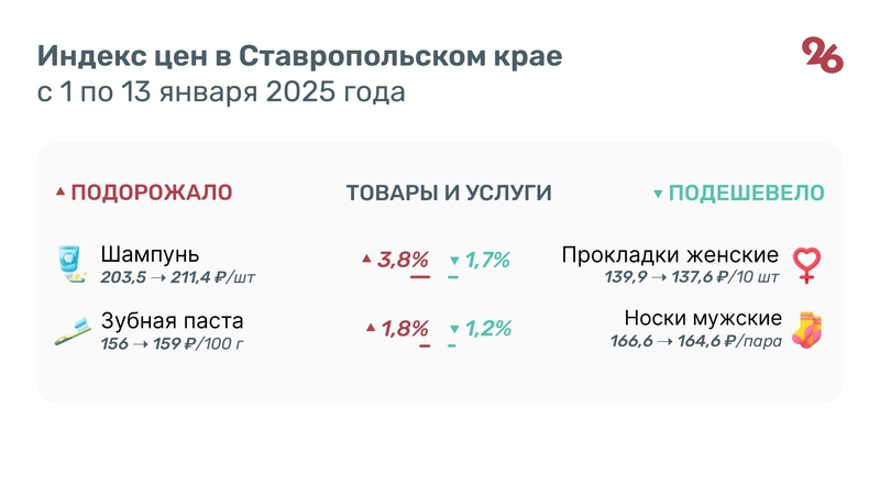 Среди непродовольственных товаров и услуг в Ставропольском крае на 4,7% выросла цена проезда в городских автобусах — 30,7 руб. в среднем. На 3,8% подорожал шампунь — 211,4 руб. за 250 мл. Капроновые колготки стали дороже на 2,3% — 301,3 руб. за пару.