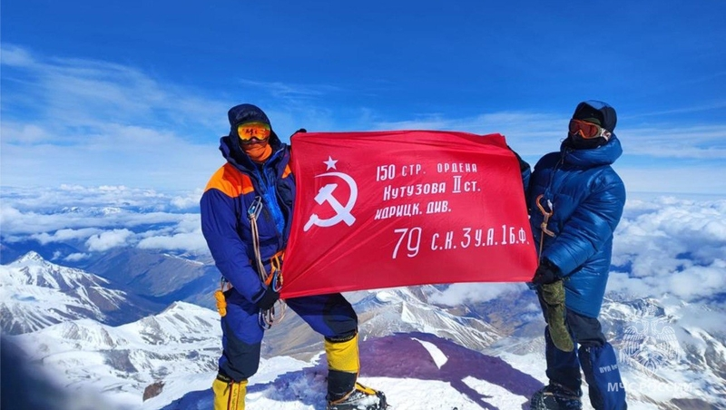 Участники восхождения на Эльбрус подняли Знамя Победы и флаг МЧС России. Патриотическая акция приурочена к 78-летней годовщине Победы в Великой Отечественной войне.