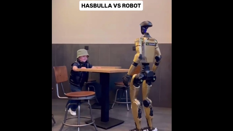 Блогер приехал в бургерную, чтобы заснять на видео совместное приготовление еды для рекламной интеграции. В какой-то момент, когда Хасбик сидел за столом, в его стул врезался робот, после чего началась потасовка. Дагестанский лидер мнений заставил робота убегать от него, затем пытался задавить того столом, побоксировал и несколько раз уложил соперника.