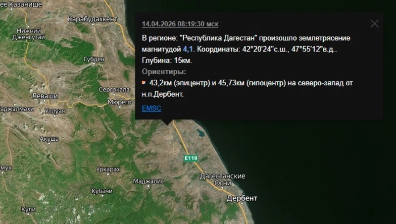 В 5:19 14 апреля в Дагестане зафиксировали подземные толчки магнитудой 4,1. Эпицентр сейсмоактивности находился на глубине 15 км. Ближайший крупный населённый пункт от гипоцентра активности — в 46 км — Дербент.