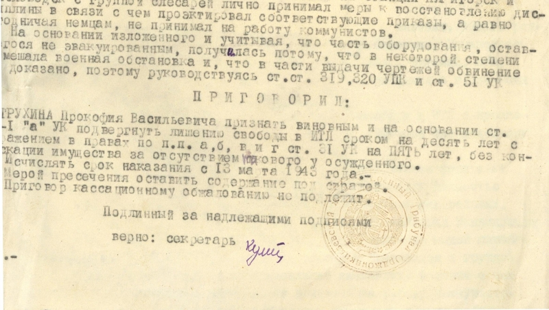 В документах говорится, что в августе 1942 года Петрухин работал начальником части водоснабжения Минераловодского паровозного отделения Орджоникидзевской железной дороги. Перед оккупацией он, по данным следствия, уклонился от эвакуации сам и не принял необходимых мер для транспортировки оборудования и подчинённых. Из-за этого они остались на территории, захваченной нацистами.