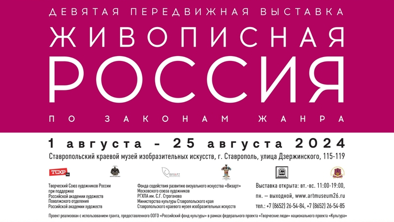 С 1 по 25 августа в рамках федерального проекта «Творческие люди» национального проекта «Культура», который в регионе курирует минкульт Ставрополья, в краевом музее изобразительных искусств пройдёт первая передвижная выставка «Живописная Россия — 2024. По законам жанра».