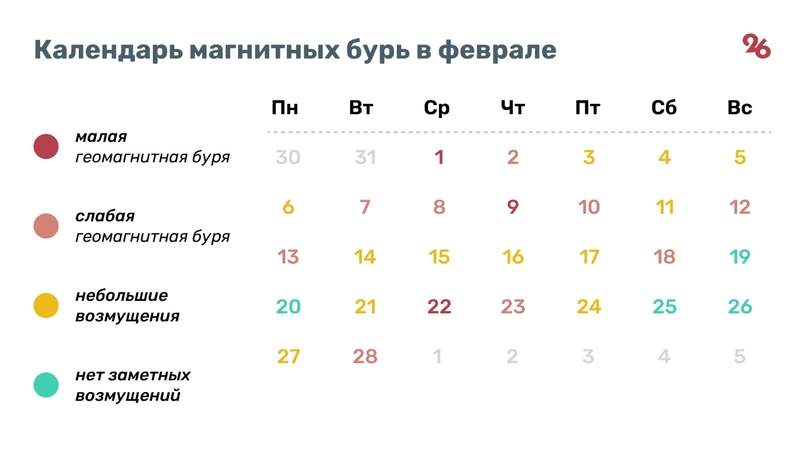 Затем небольшое негативное влияние можно будет ощутить 7–10, 12–13 и 18 февраля. При этом с 21:00 8 февраля до 18:00 9 февраля в регион вновь придёт малая магнитная буря.