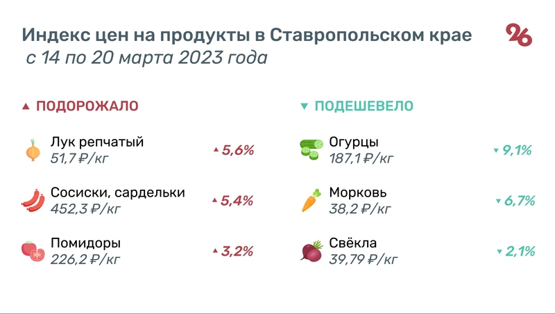 За неделю с 14 по 20 марта в Ставропольском крае из продуктов подорожали сосиски, лук и помидоры, а подешевели огурцы, морковь и свёкла. Рост, по данным Северо-Кавказстата, составил 5,4%, 5,6% и 3,2%, соответственно, а понижение 9,1%, 6,7% и 2,1%.