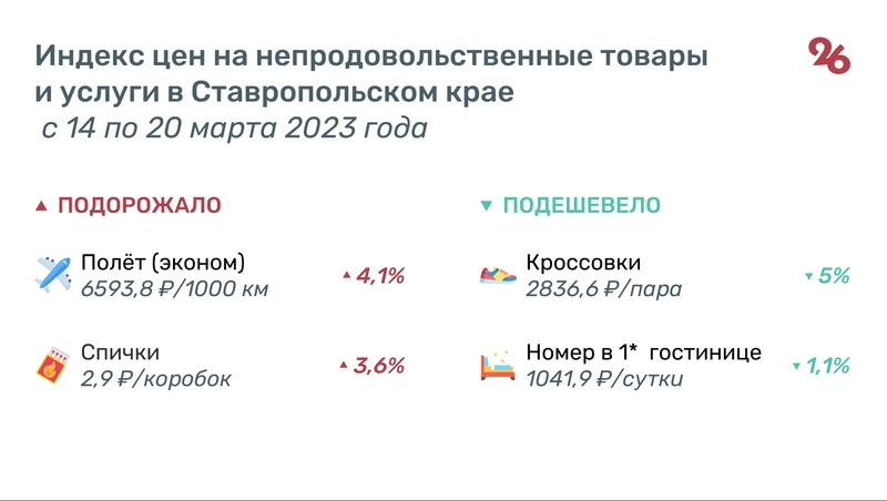 Также ведомство выложило и изменение цен на товары и услуги. По их информации сильнее всего среди товаров в крае выросли в цене спички — на 3,6%, и авиаперелёт эконом-классом — на 4,1%. А подешевели кроссовки для взрослых — на 5% и номера в однозвёздночной гостинице — на 1,1%.