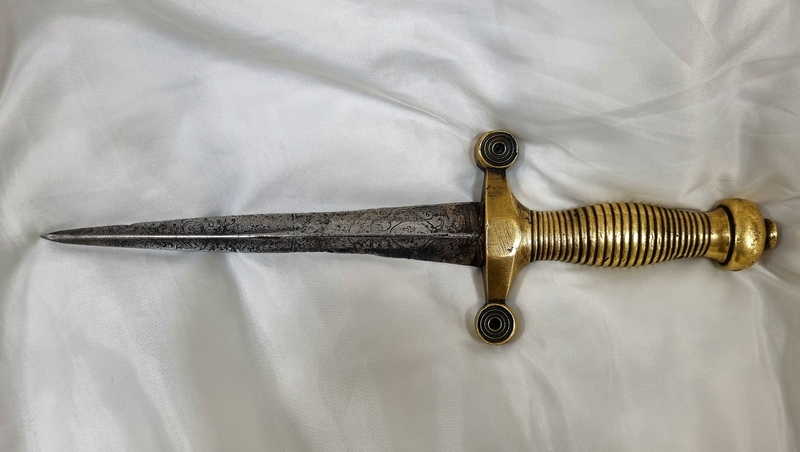 Эксперты выяснили, что оружие было переточено из разных элементов боевых кинжалов кустарным способом почти триста лет назад. Рукоять клинка сделана из французского солдатского пехотного тесака 1831 года и обломка шпажного клинка колишемарда конца XVII — начала XIX века.