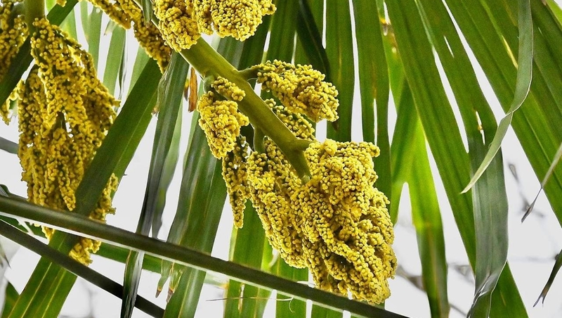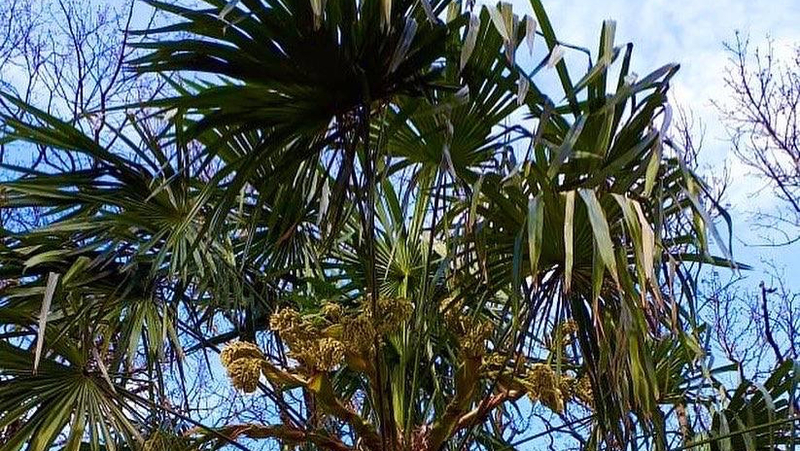 С приходом тепла купол с пальмы сняли и обнаружили на ней крупные бутоны. А вскоре распустились и яркие жёлтые цветы с приятным сладким запахом.