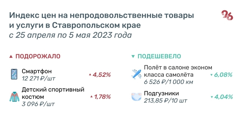 Среди непродовольственных товаров с 25 апреля по 5 мая на 4,52% выросла средняя цена смартфона — 12271 руб. и на 1,78% — детского спортивного костюма — 3096 руб. На 2,83% подорожала зубная паста.