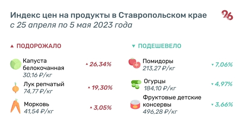 В Ставропольском крае продолжают дорожать овощи. Цена лука (74,77 руб.) и капусты (30,16 руб.) растёт вторую неделю — с 25 апреля по 5 мая эти овощи подорожали на 19% и 26% соответственно. На 3% увеличилась стоимость моркови — 41,54 руб. Цена печенья, бананов и детских сухих смесей выросла почти на 2% — 217, 135 и 967 руб. соответственно.