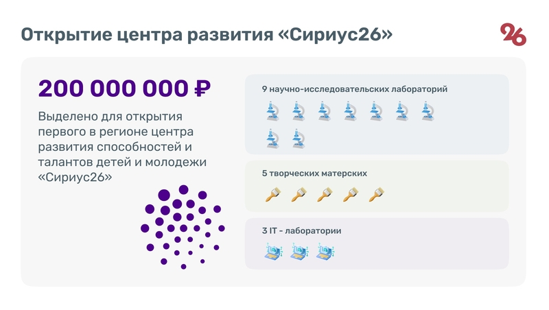 В четверг, 25 мая, губернатор Ставропольского края Владимир Владимиров выступил с ежегодным посланием перед депутатами, сенаторами, руководителями органов власти и военнослужащими. Глава региона рассказал о центре «Сириус26», который в 2023 году откроют по президентскому нацпроекту. В него вложат порядка 200 млн рублей. В рамках центра будут работать научно-технические и IT-лаборатории, а также творческие мастерские. Эту работу будет курировать минобр Ставрополья.