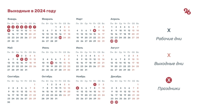 Новогодние каникулы в 2024 году планируется провести с 29 декабря по 8 января — всего десять дней. За счёт переноса выходных и праздничных дней поздней весной граждане отдохнут по четыре дня подряд: с 28 апреля по 1 мая и с 9 по 12 мая.