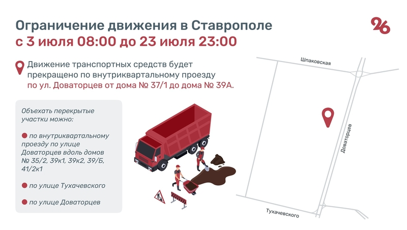 Реконструкция газопровода, обеспечивающего ресурсом юго-запад города, пройдёт с 3 по 23 июля. Из-за этого будет перекрыто движение транспорта по улице Доваторцев от дома № 37/1 до дома № 39а. Объехать перекрытый участок можно будет вдоль домов № 35/2, 39к1, 39к2, 39кБ, 41/2к1 по улице Доваторцев, а также по улице Тухачевского.