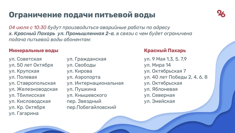 Воду абонентам Минвод 4 июля ограничат по улицам Советской, 50 лет Октября, Крупской, Полевой, Ставропольской, Железноводской, Тбилисской, Кисловодской, Красного Октября, Гагарина, Гражданской, Свободы, Кирова, Змейской, Аэропорта, Интернациональной, Пушкина, Кнышевского, а также по переулкам Звёздному и Побегайловскому.