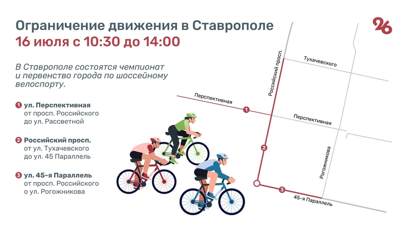 В воскресенье, 16 июля, в Ставрополе состоятся чемпионат и первенство города по шоссейному велоспорту. Участие в соревнованиях примут около сотни человек. Среди них жители пяти городов региона от 12 лет и старше.