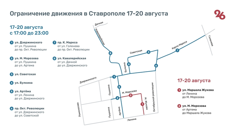 На протяжении трёх дней будут закрыты улицы Маршала Жукова и Михаила Морозова. Ежедневно с 17:00 до 23:00 водители не смогут проехать улицам Советской, Булкина, Артёма, Михаила Морозова, Кавалерийской, Дзержинского, по проспекту Октябрьской Революции и Карла Маркса.