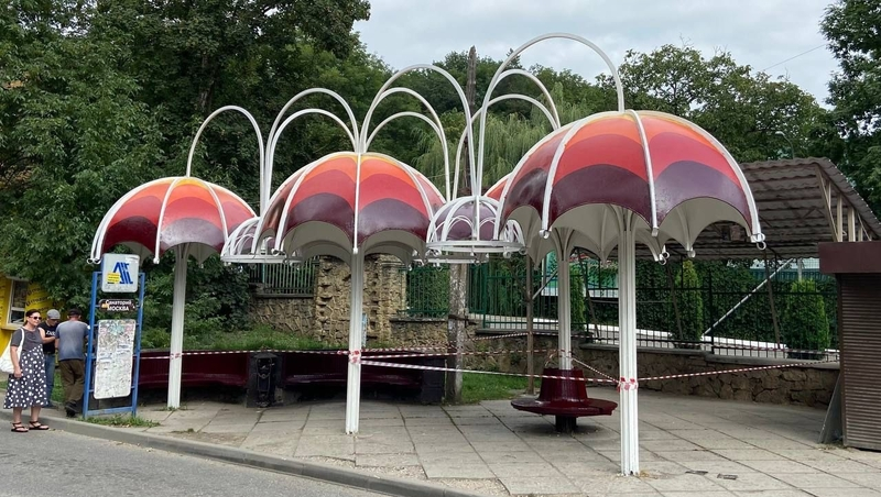 Остановка на проспекте Дзержинского в Кисловодске выполнена в форме зонтиков. Ещё в советские времена внимание туристов привлекала эта оригинальная архитектурная композиция. Однако за годы эксплуатации остановка сильно износилась и нуждалась в реставрации.