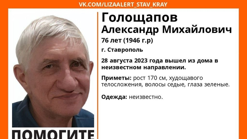 28 августа пропал 76-летний Александр Голощапов, житель Ставрополя. Он вышел из дома, пошёл в неизвестном направлении и не вернулся. Об этом сообщили в региональном отделении поискового отряда «ЛизаАлерт».