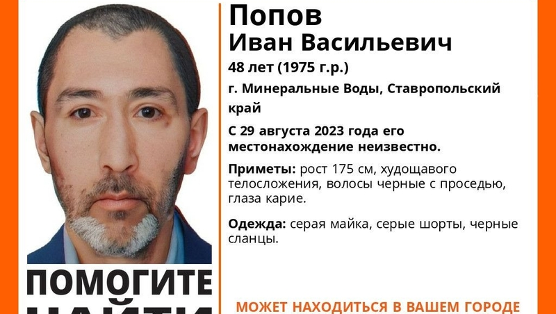 На Ставрополье идут поиски Ивана Попова 1975 года рождения. Рост пропавшего — 175 см, у него худощавое телосложение. Цвет глаз карий, волосы чёрные с проседью. На момент исчезновения на нём были серая майка и шорты, на ногах — чёрные сланцы.
